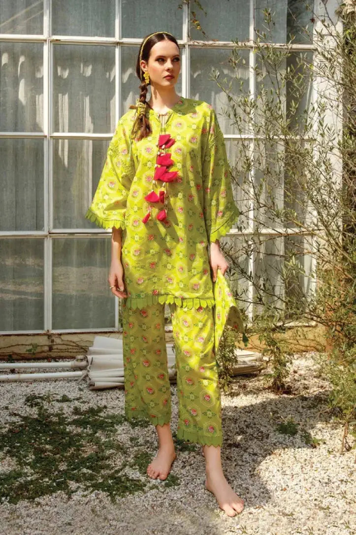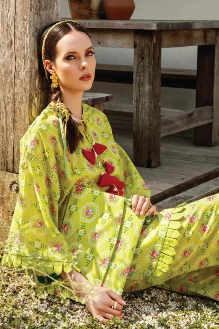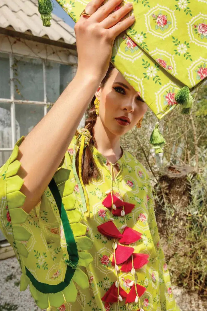 An incandescent print is adorned with delicate flowers emblazoned on a citron apple green canvas. This vibrantly chic print promises a carefree & easily transitional from day to night.