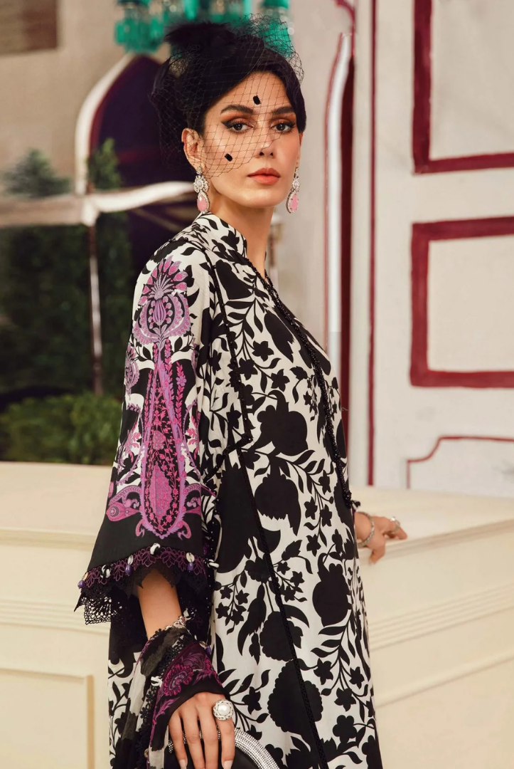3 Piece Stitched Embroidered Linen Rani Mahal by Maria B M prints Fall Edit'25 Winter Collection comes with: