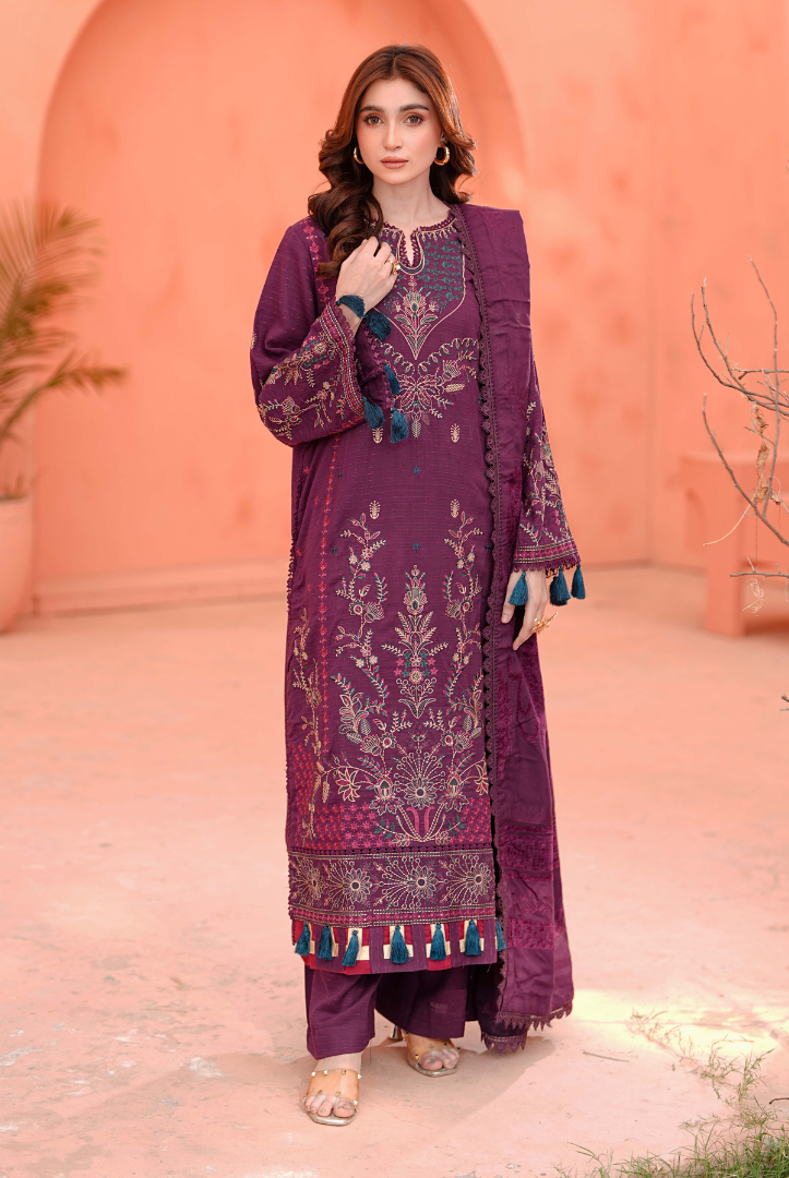 - Upgrade your winter wardrobe with this premium luxury 3-piece stitched suit from Hoorish by Johra. Designed with elegant embroidery on high quality Dhanak fabric and paired with an exclusive Jacquard velvet shawl, this outfit offers warmth, comfort, and timeless style perfect for the winter season.