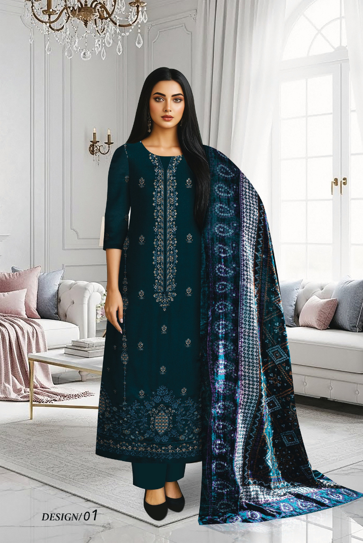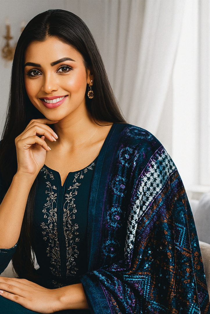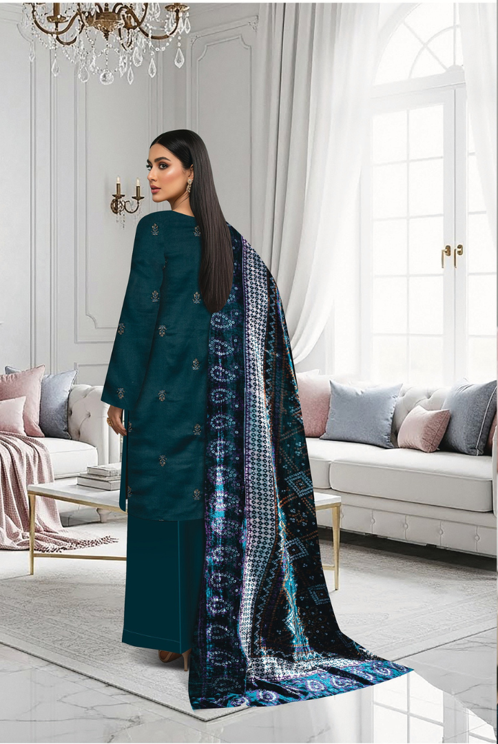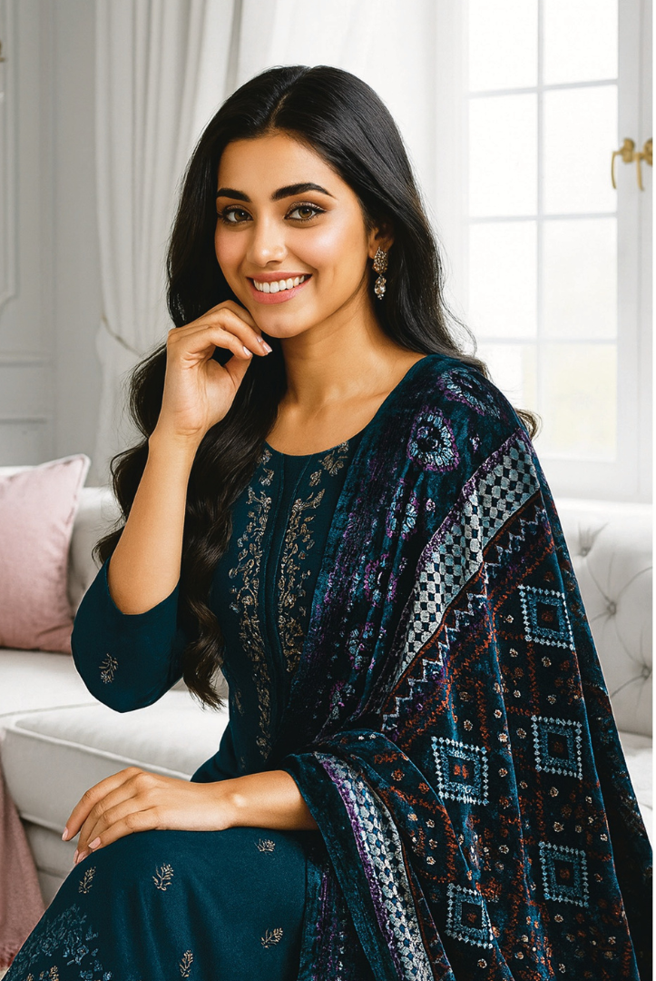 Elevate your winter wardrobe with this elegant MEHAK 3-Piece Dhanak Suit, thoughtfully designed for warmth and timeless style. The outfit features a beautifully embroidered Dhanak shirt, paired with a luxurious printed Plachi shawl that adds a graceful seasonal charm. Completed with a plain Dhanak trouser, this ensemble is perfect for both casual gatherings and semi-formal winter wear.