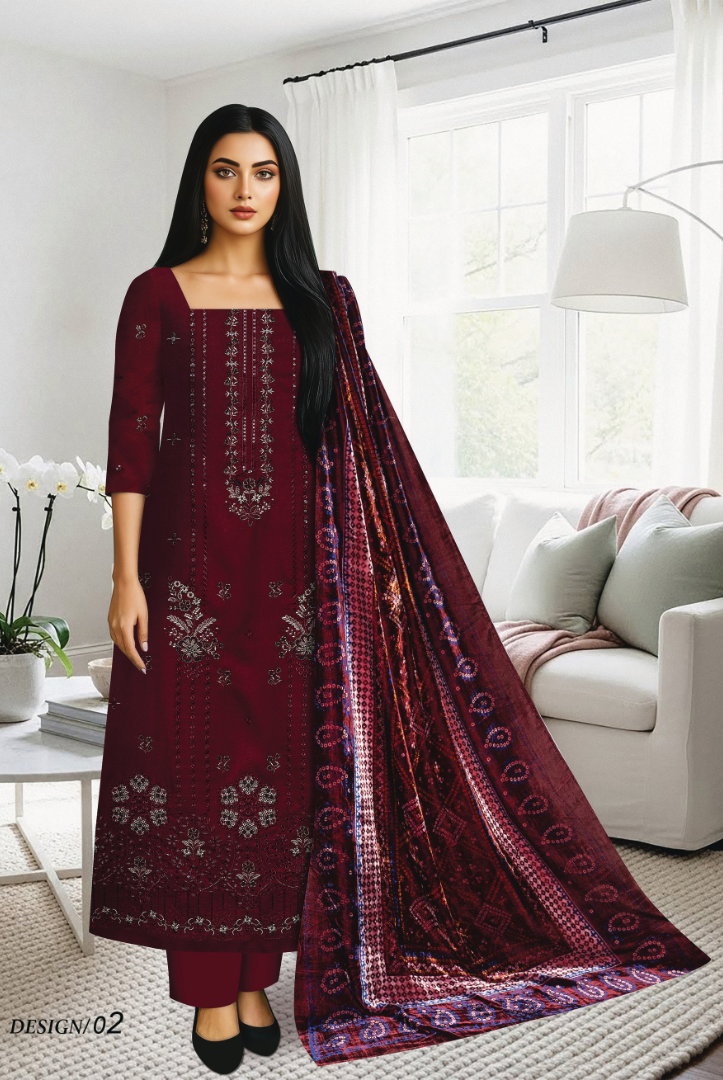 Elevate your winter wardrobe with this elegant MEHAK 3-Piece Dhanak Suit, thoughtfully designed for warmth and timeless style. The outfit features a beautifully embroidered Dhanak shirt, paired with a luxurious printed Plachi shawl that adds a graceful seasonal charm. Completed with a plain Dhanak trouser, this ensemble is perfect for both casual gatherings and semi-formal winter wear.