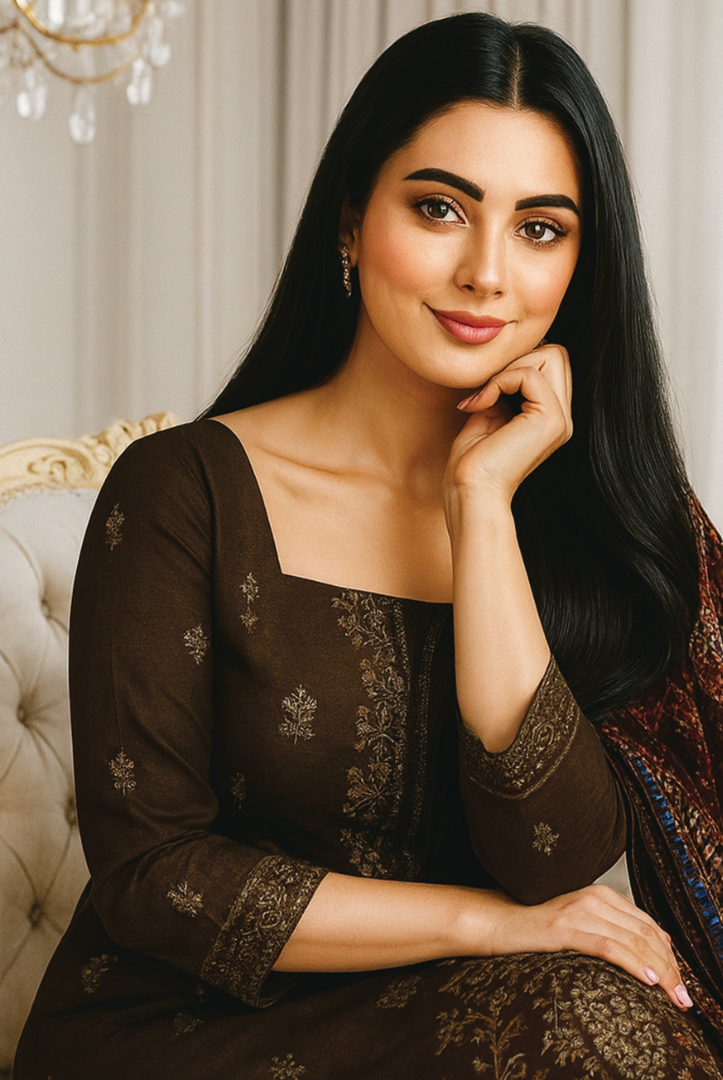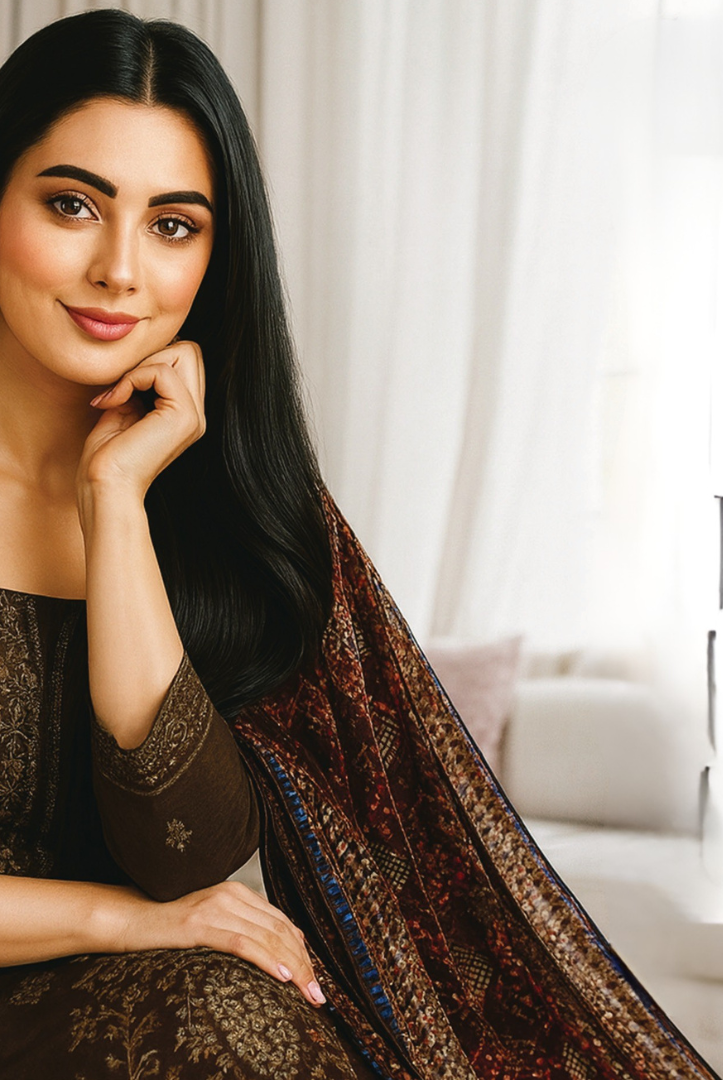 Elevate your winter wardrobe with this elegant MEHAK 3-Piece Dhanak Suit, thoughtfully designed for warmth and timeless style. The outfit features a beautifully embroidered Dhanak shirt, paired with a luxurious printed Plachi shawl that adds a graceful seasonal charm. Completed with a plain Dhanak trouser, this ensemble is perfect for both casual gatherings and semi-formal winter wear.