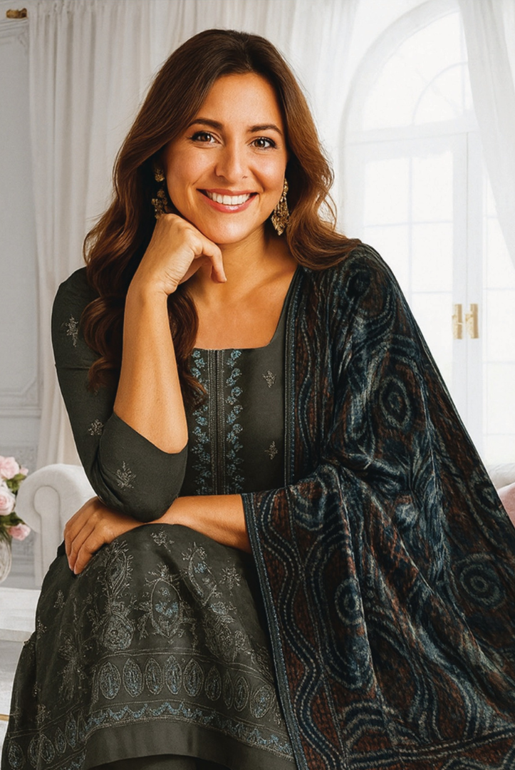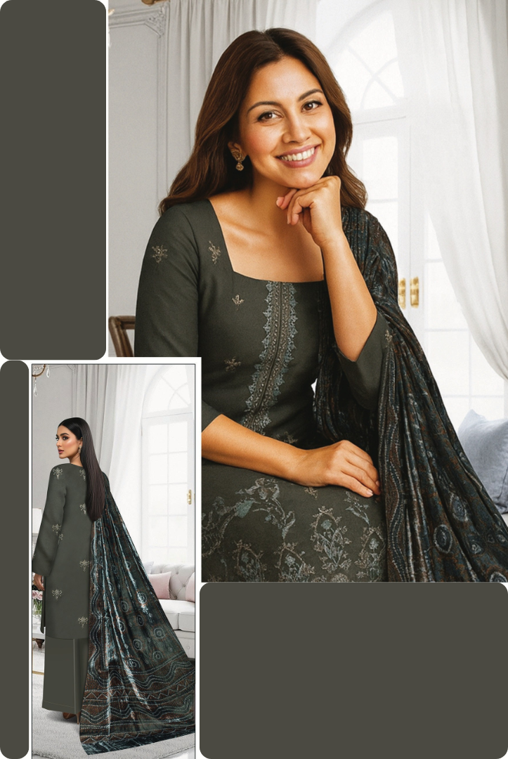 Elevate your winter wardrobe with this elegant MEHAK 3-Piece Dhanak Suit, thoughtfully designed for warmth and timeless style. The outfit features a beautifully embroidered Dhanak shirt, paired with a luxurious printed Plachi shawl that adds a graceful seasonal charm. Completed with a plain Dhanak trouser, this ensemble is perfect for both casual gatherings and semi-formal winter wear.
