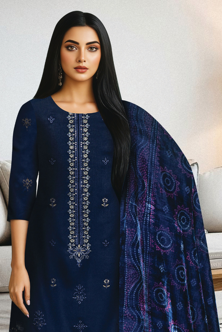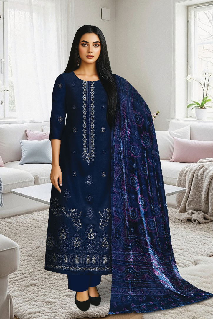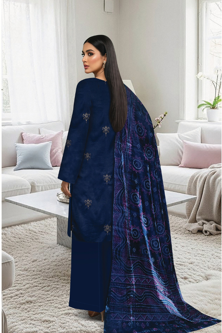 Elevate your winter wardrobe with this elegant MEHAK 3-Piece Dhanak Suit, thoughtfully designed for warmth and timeless style. The outfit features a beautifully embroidered Dhanak shirt, paired with a luxurious printed Plachi shawl that adds a graceful seasonal charm. Completed with a plain Dhanak trouser, this ensemble is perfect for both casual gatherings and semi-formal winter wear.