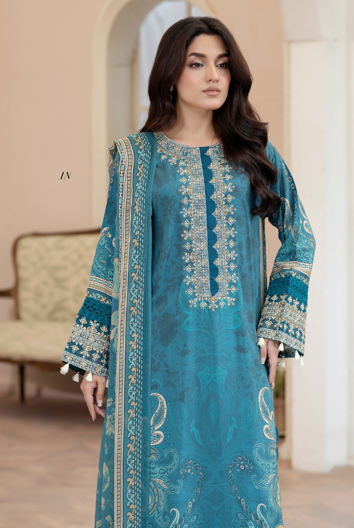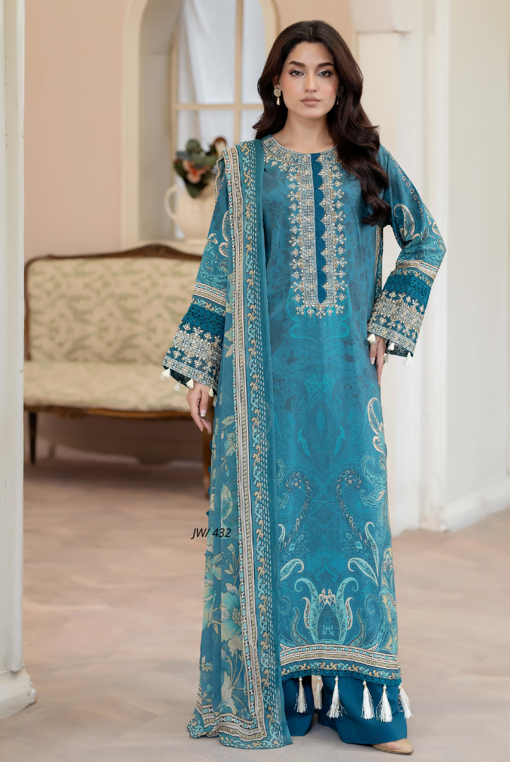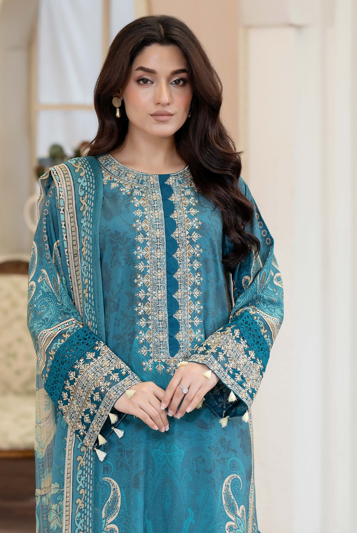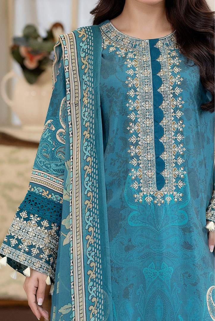 3 Piece Stitched Embroidered Printed Staple Slub Suit SHIRSA by JOHRA Collection comes with: