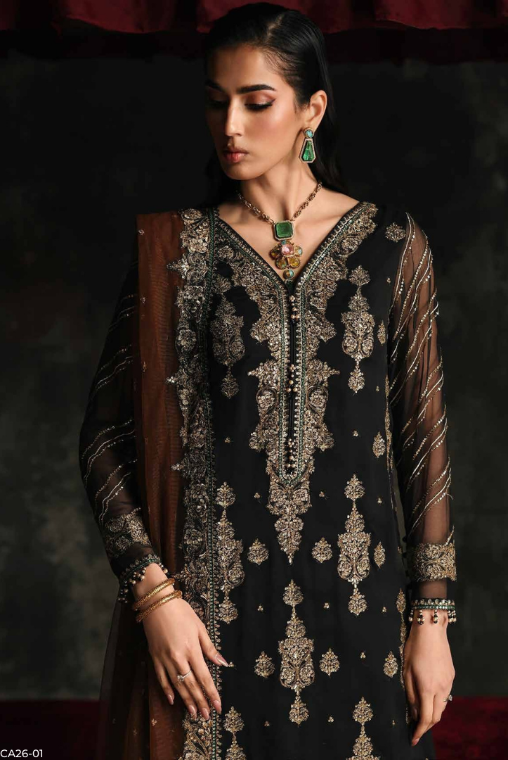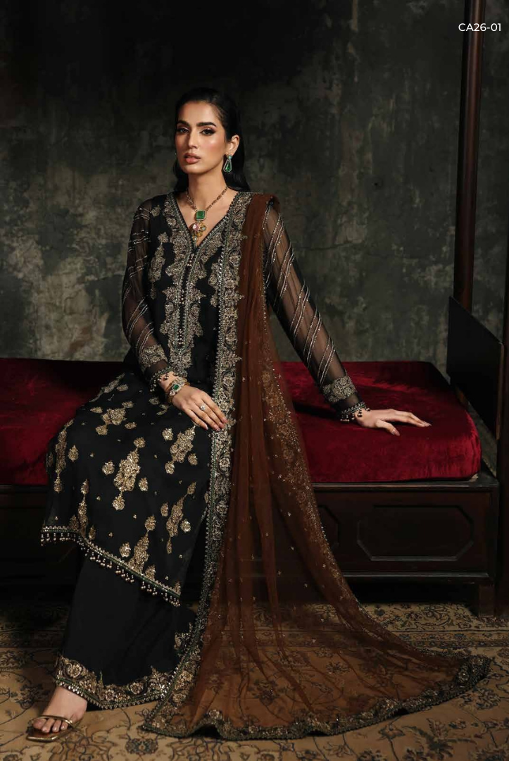 Step into elegance with C Charizma Aura – Volume-1 Limited Edition, now available in a beautifully crafted stitched design. This luxury chiffon ensemble is created for women who appreciate sophistication, fine detailing, and timeless style.