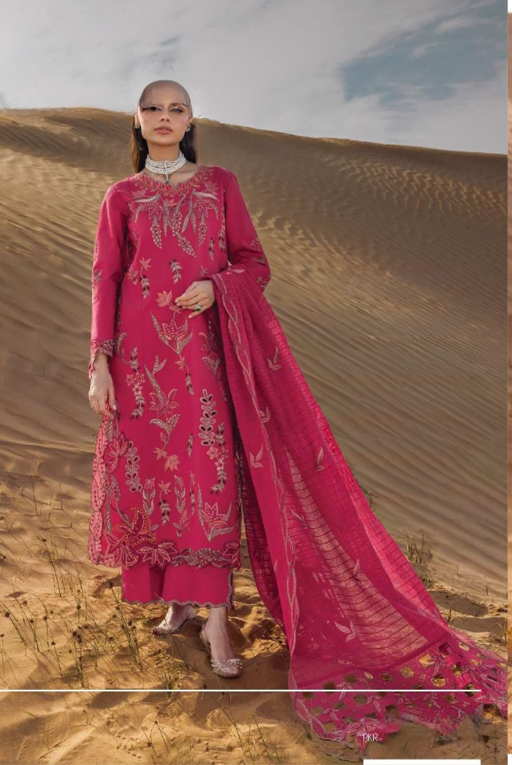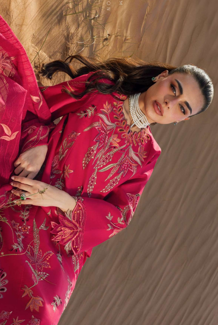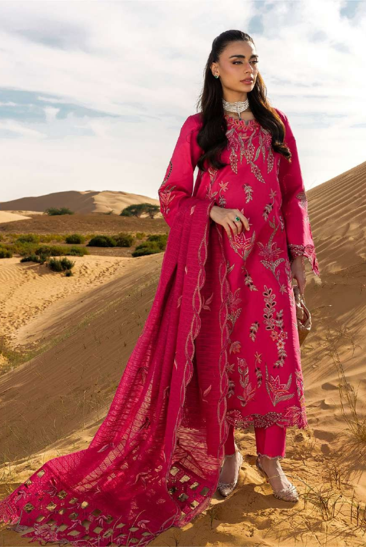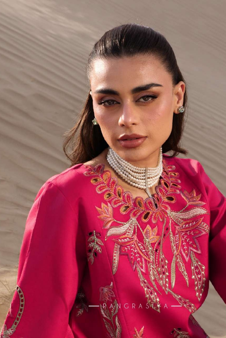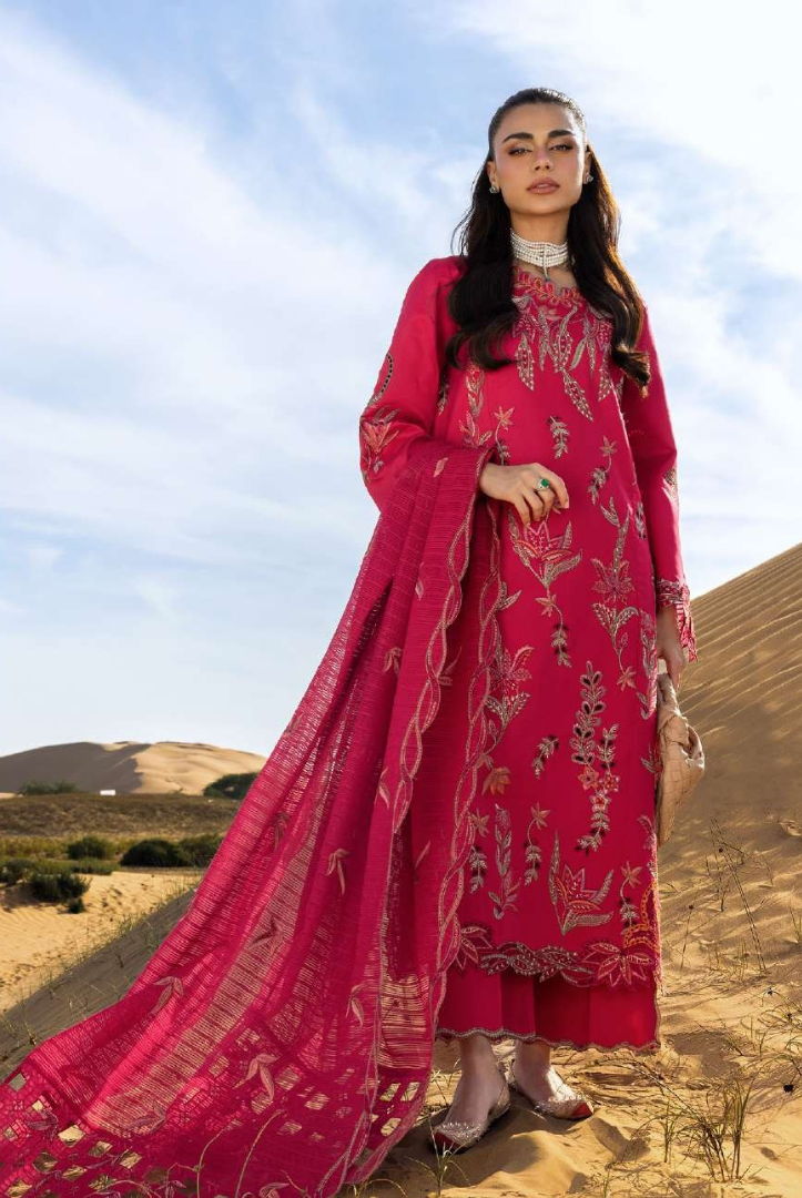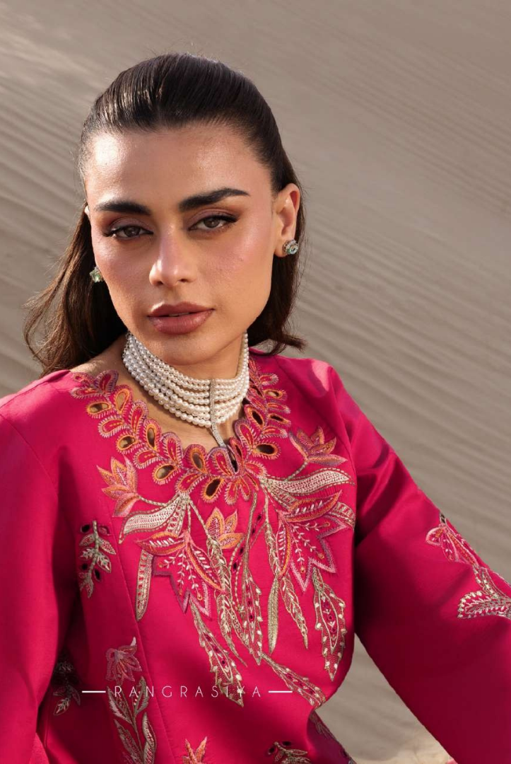 This elegant 3-piece luxury lawn suit from Rang Rasiya features a beautifully crafted long panel style embroidered lawn shirt, paired with a straight cotton trouser with organza border and a textured embroidered dupatta with corner motifs. The design includes intricate embroidery, delicate organza patches, and 3D floral details that enhance the overall premium look.
