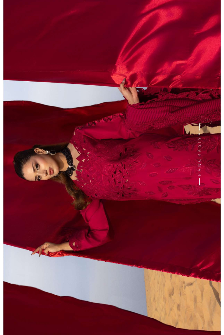 This elegant 3-piece luxury lawn suit from Rang Rasiya features a beautifully crafted long panel style embroidered lawn shirt, paired with a straight cotton trouser with organza border and a textured embroidered dupatta with corner motifs. The design includes intricate embroidery, delicate organza patches, and 3D floral details that enhance the overall premium look.