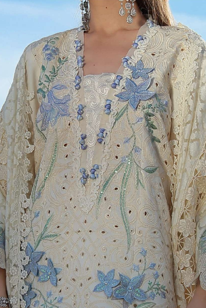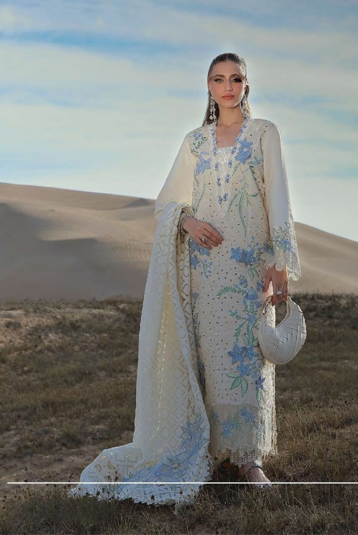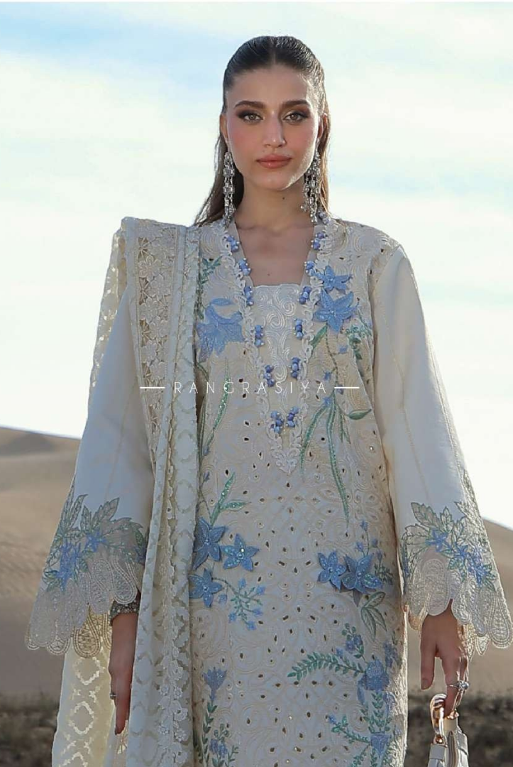 This elegant 3-piece luxury lawn suit from Rang Rasiya features a beautifully crafted long panel style embroidered lawn shirt, paired with a straight cotton trouser with organza border and a textured embroidered dupatta with corner motifs. The design includes intricate embroidery, delicate organza patches, and 3D floral details that enhance the overall premium look.