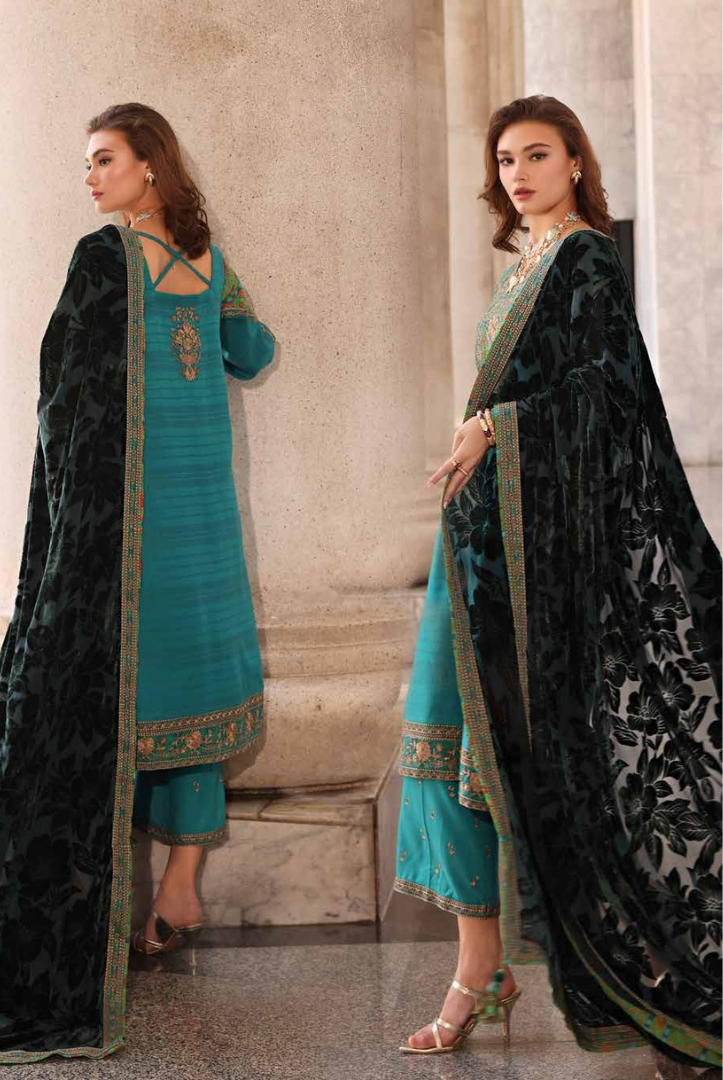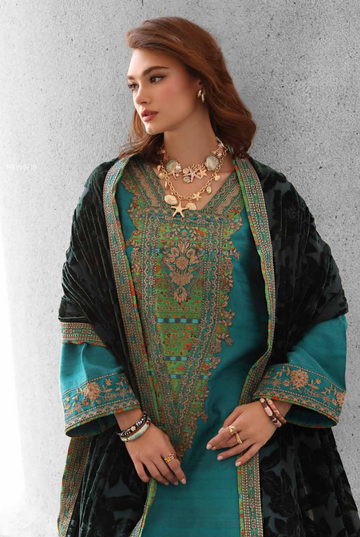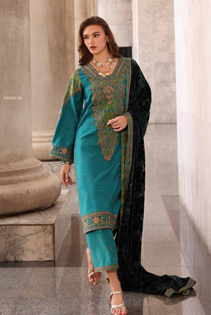3 Piece Stitched Peach Leather Ensemble with Embroidered Velvet Shawl CHARIZMA Poshima (Vol-111) PSW5 Winter Collection comes with: