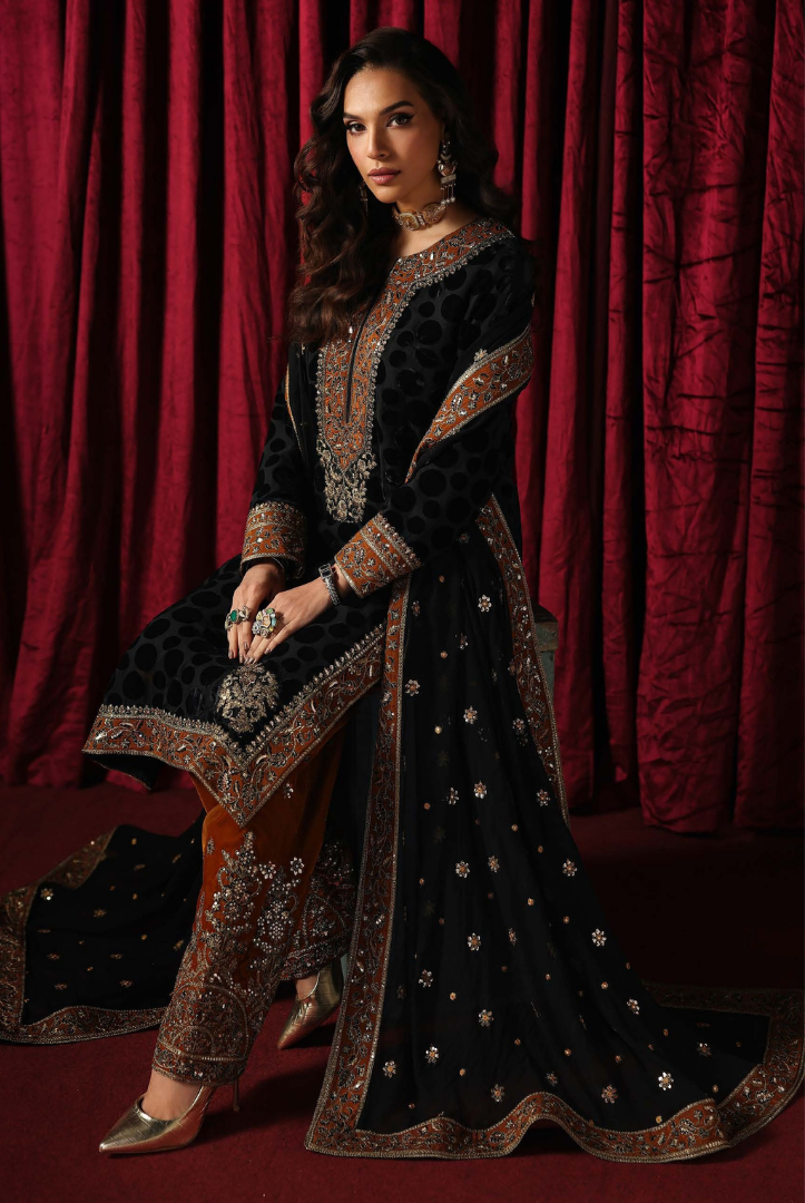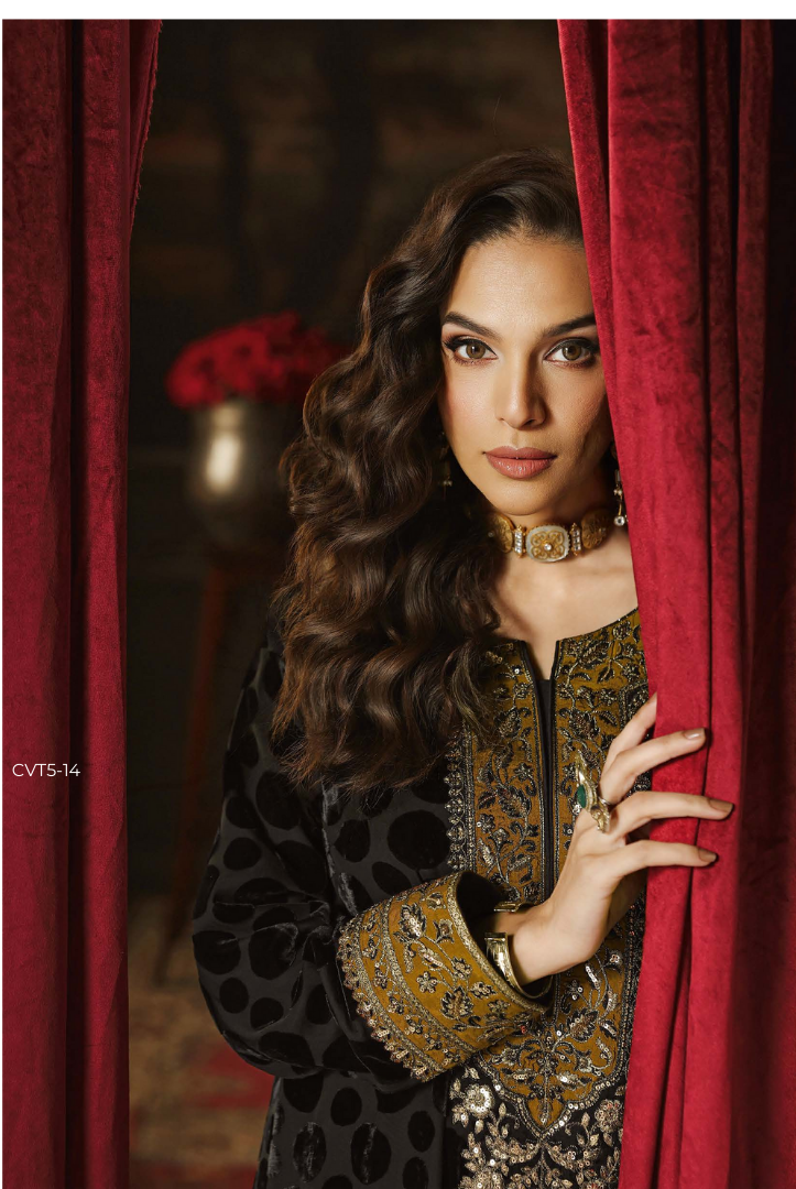 3 Piece Stitched Premium Embroidered Plachi Velvet Suit Signora by Charizma Volume II  | Winter Collection CVT5 comes with:
