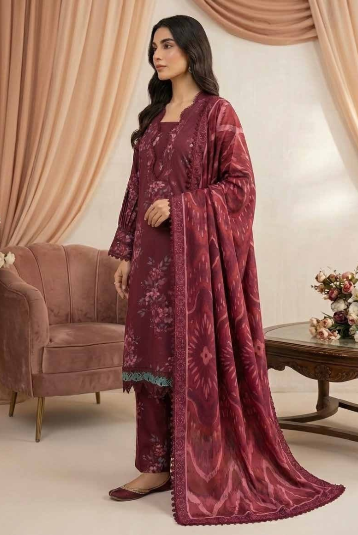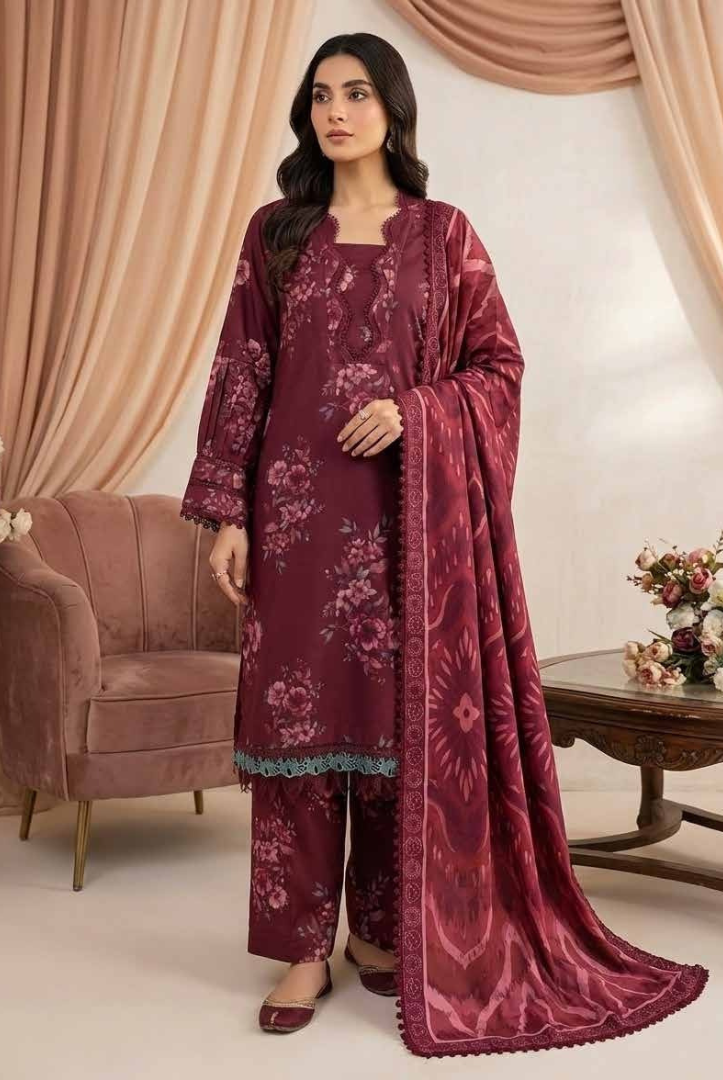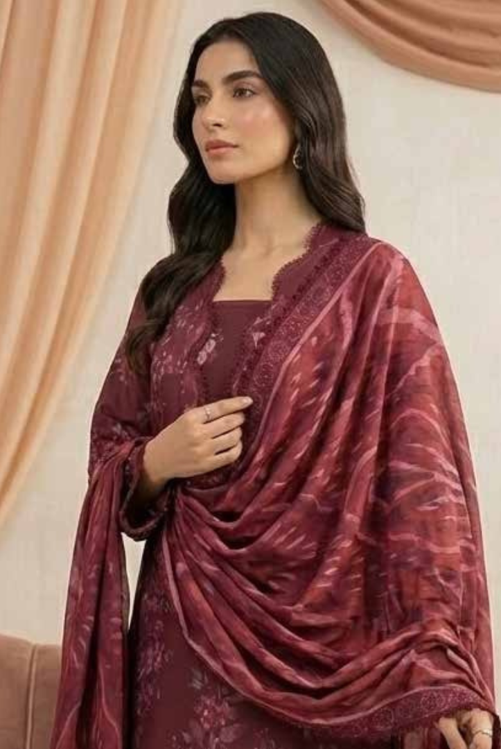 Upgrade your winter wardrobe with this elegant Johar Khaas 3-piece stitched suit. Featuring a beautifully printed shirt, matching printed trousers, and a coordinated printed shawl, this winter collection outfit blends comfort with timeless style. Perfect for casual wear and semi-formal winter gatherings.