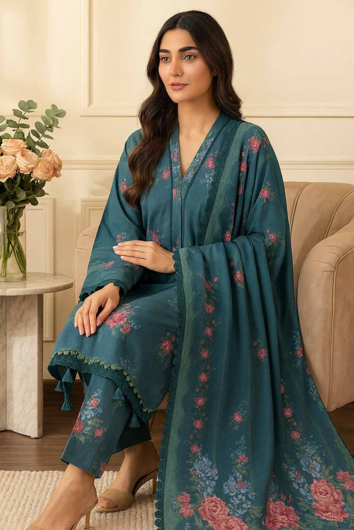 Upgrade your winter wardrobe with this elegant Johar Khaas 3-piece stitched suit. Featuring a beautifully printed shirt, matching printed trousers, and a coordinated printed shawl, this winter collection outfit blends comfort with timeless style. Perfect for casual wear and semi-formal winter gatherings.