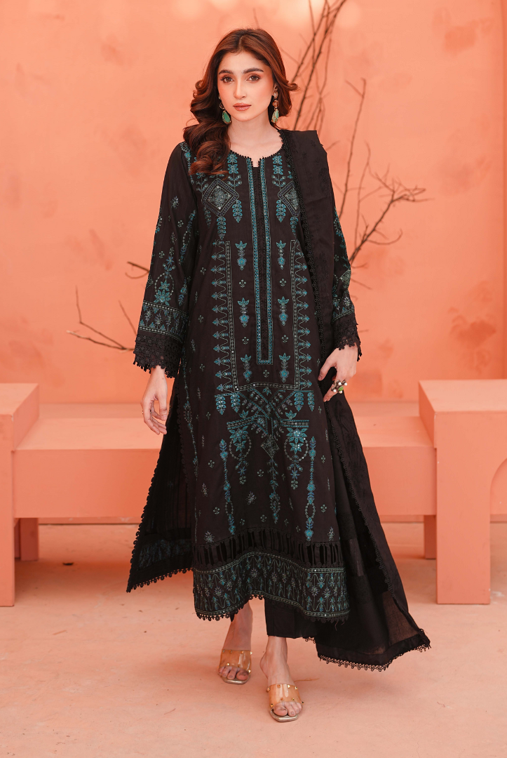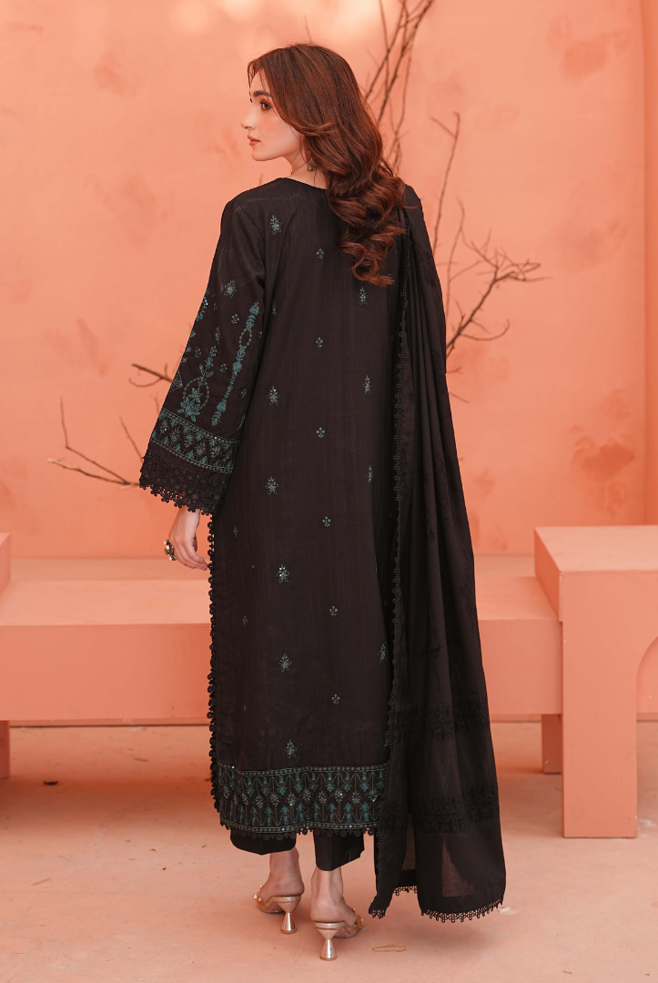 3 Piece Stitched Embroidered Dhanak Suit with Velvet Jacquard Shawl | Vihana by Johra Collection comes with: