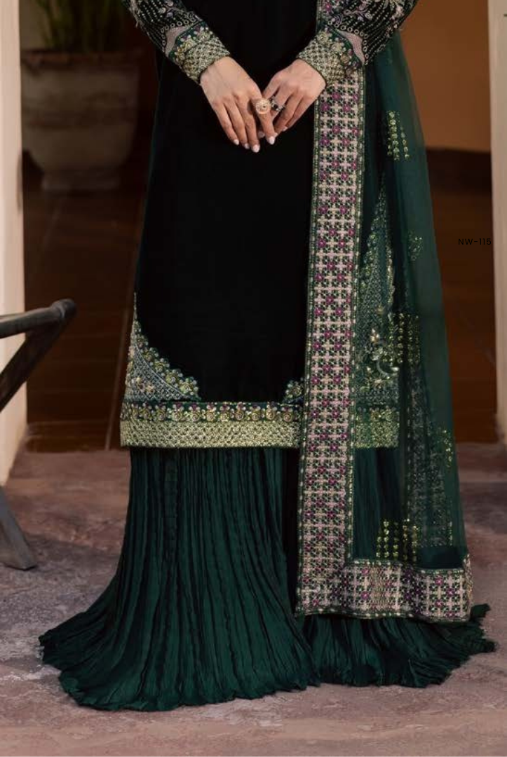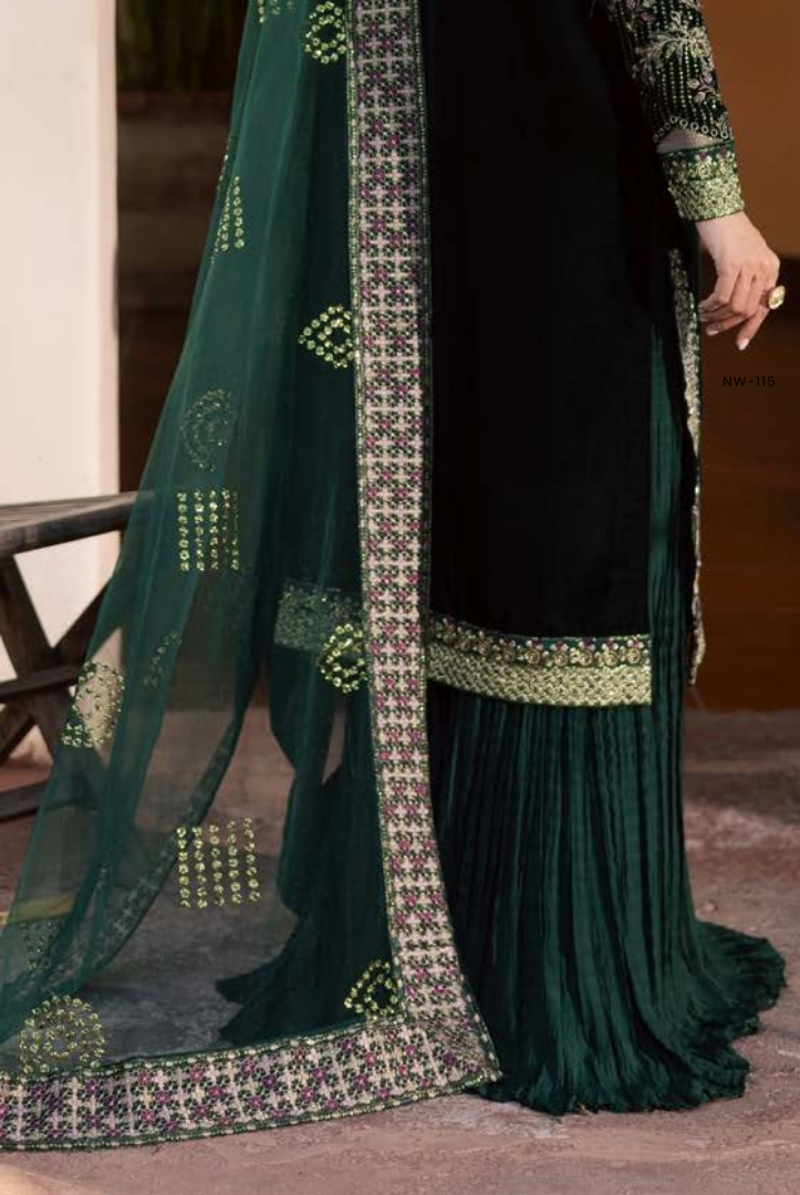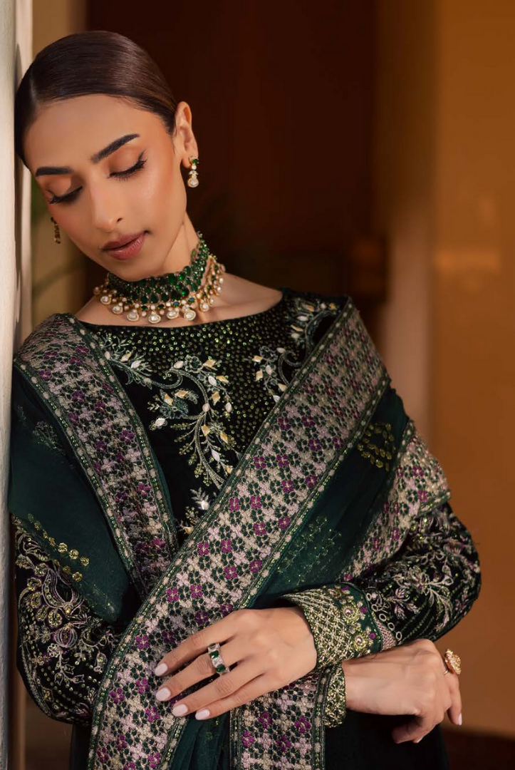 3 Piece Stitched Embroidered Velvet Suit with Shawl | Luxury Wedding Wear MAYA by Nureh VOL-02 Winter Collection comes with: