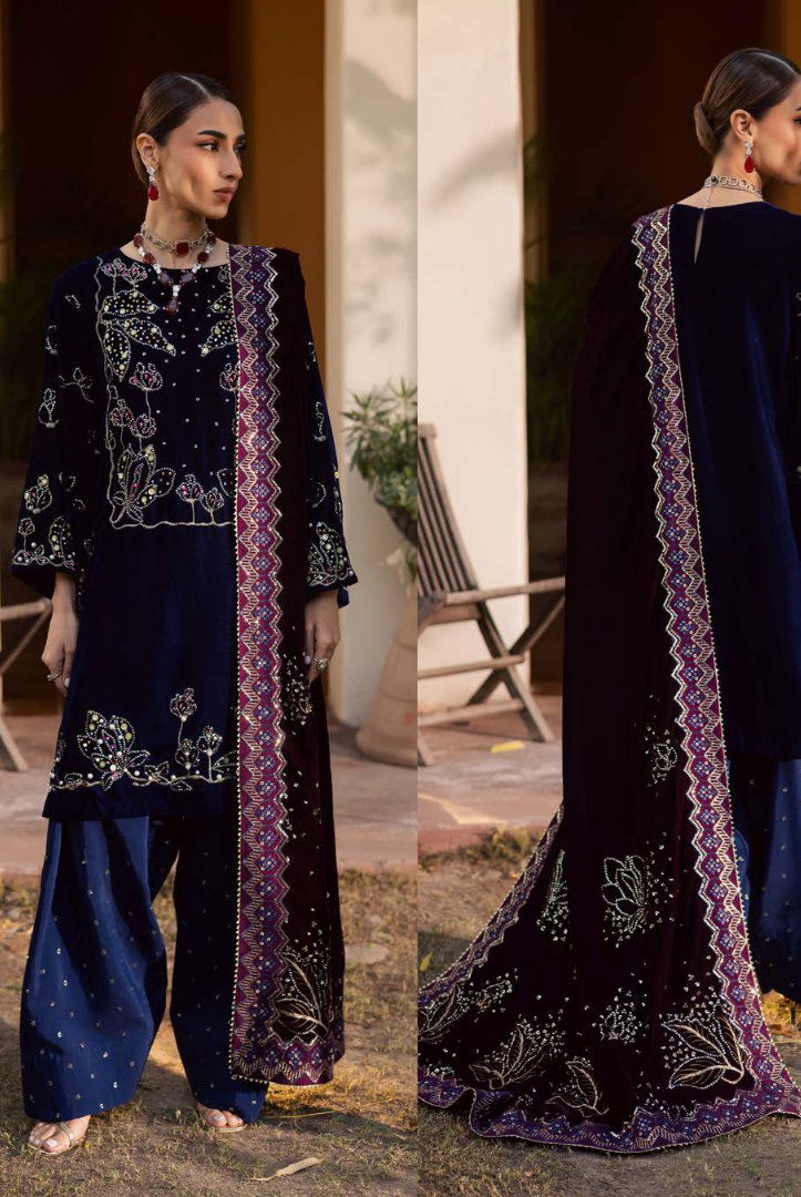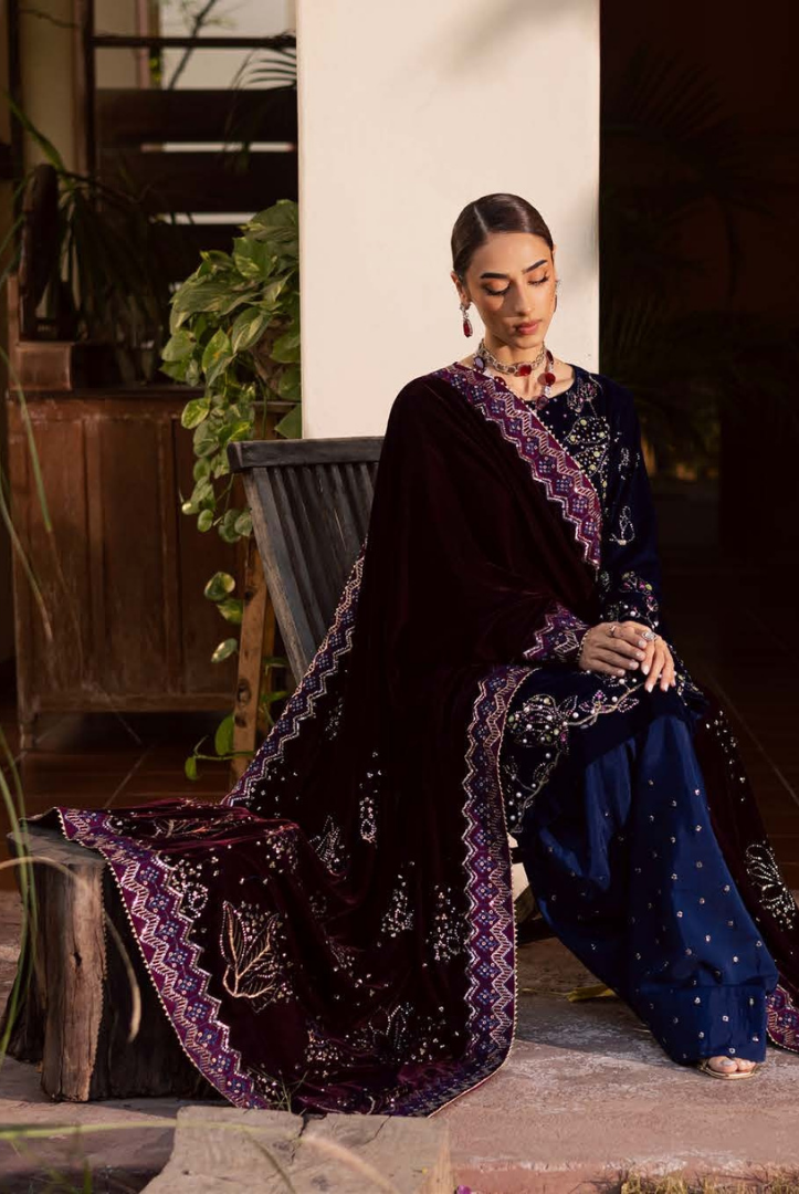 3 Piece Stitched Embroidered Velvet Suit with Shawl | Luxury Wedding Wear MAYA by Nureh VOL-02 Winter Collection comes with: