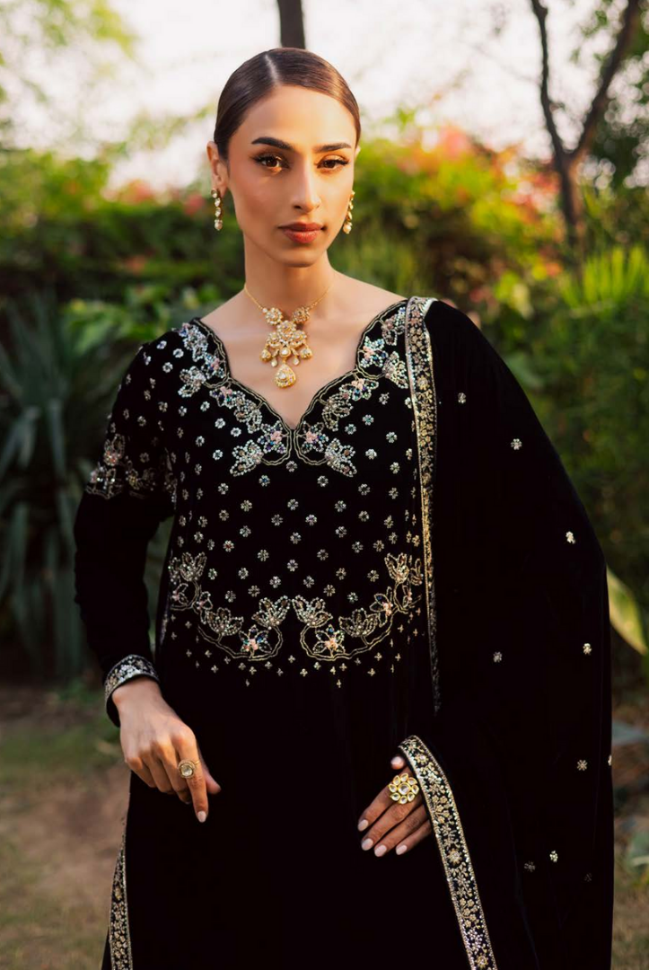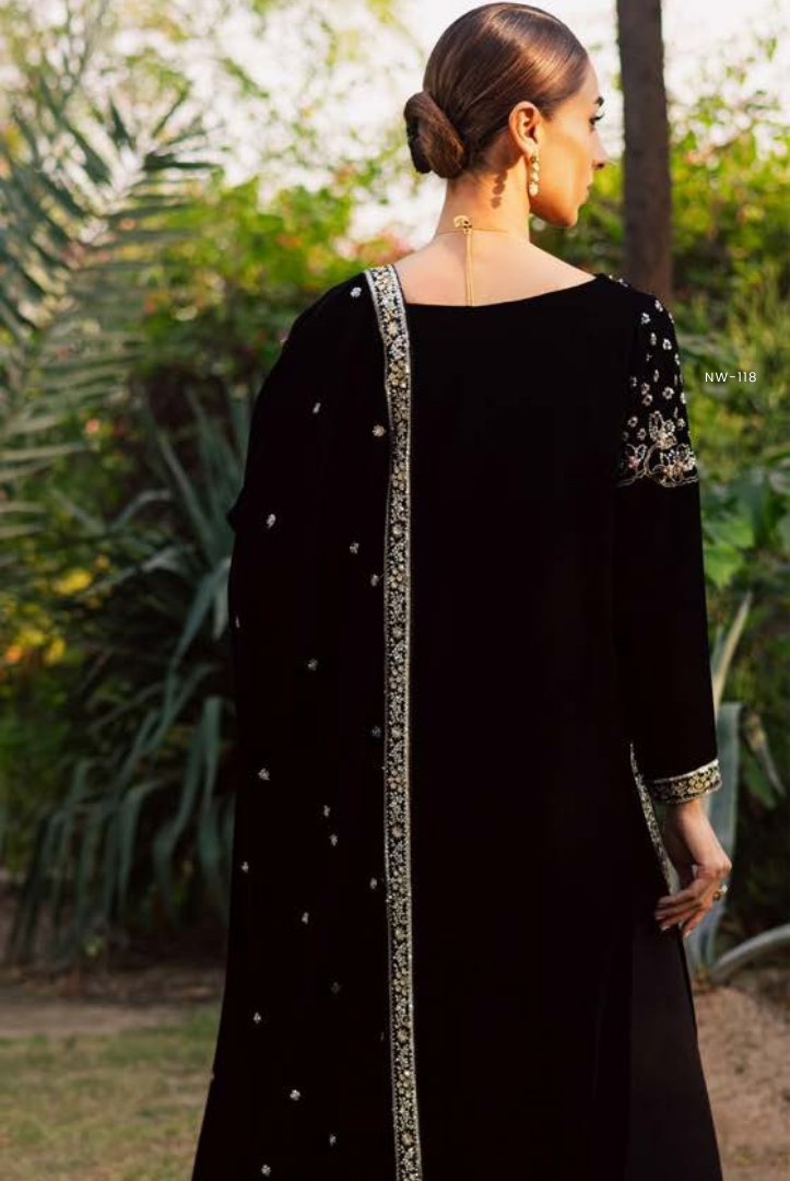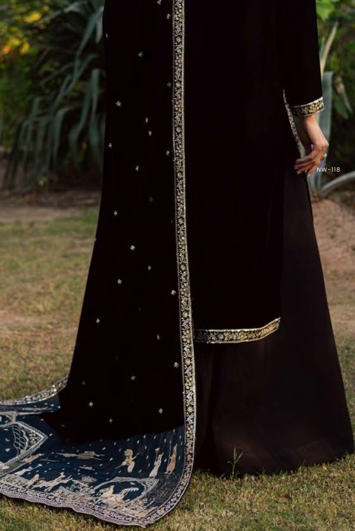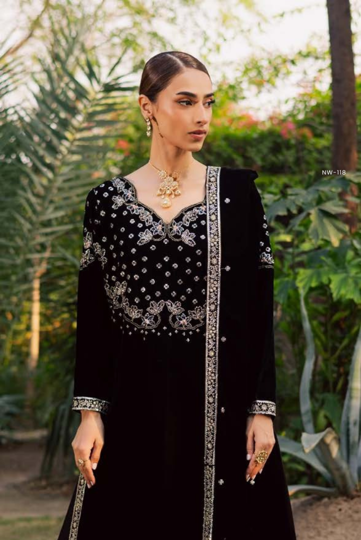 3 Piece Stitched Embroidered Velvet Suit with Shawl | Luxury Wedding Wear MAYA by Nureh VOL-02 Winter Collection comes with: