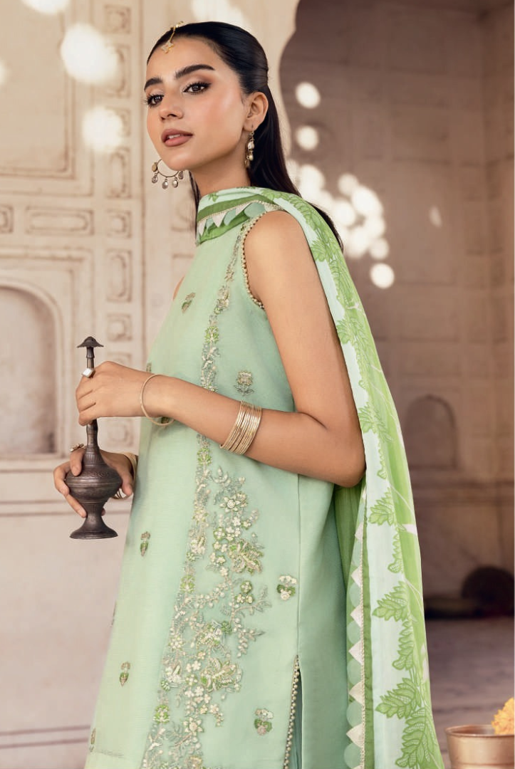 Elevate your winter wardrobe with this 3-piece stitched suit from our Winter Collection, featuring dyed silk cotton net with exquisite organza embroidery and a luxurious viscose raw silk lining. Perfect for festive gatherings and formal winter events.