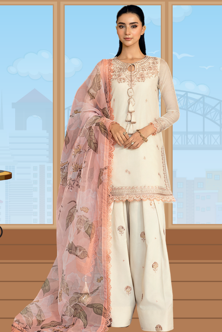 This elegant 3-piece stitched suit from our Winter Collection is designed with delicately embroidered silk cotton net and organza detailing, paired with rich viscose raw silk for a luxurious, winter-ready look.
