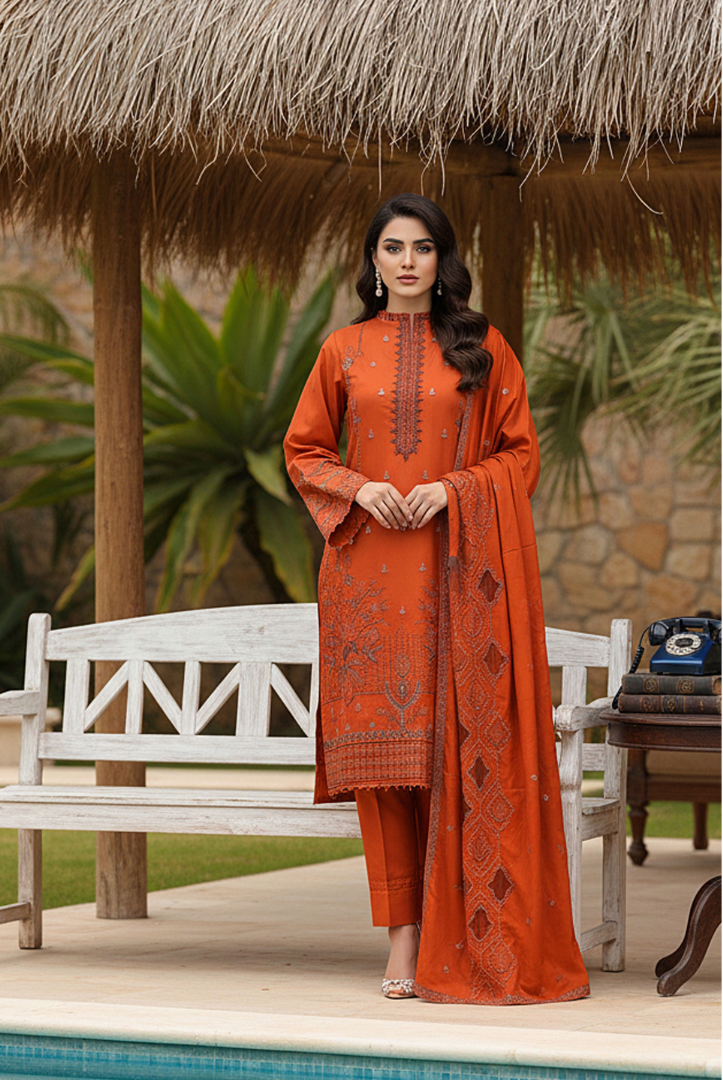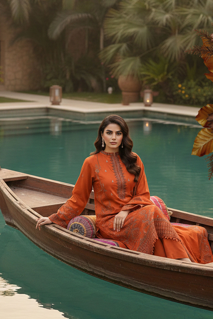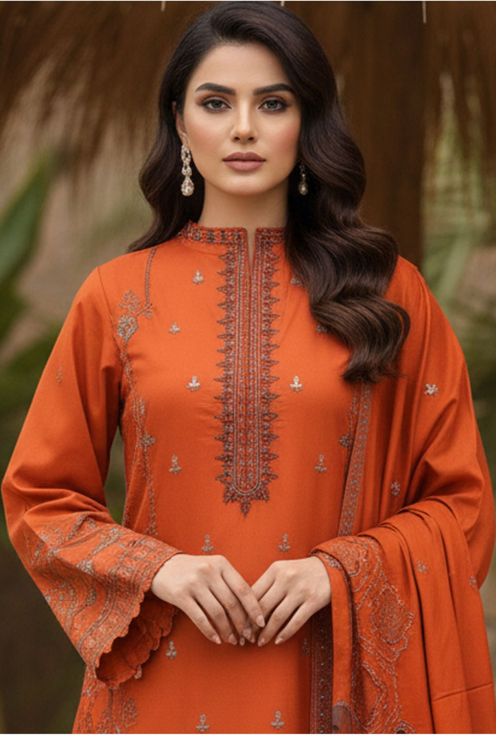 3 Piece Unstitched Embroidered Premium Linen Fabric Rose by Bin Rashid Winter Collection comes with: